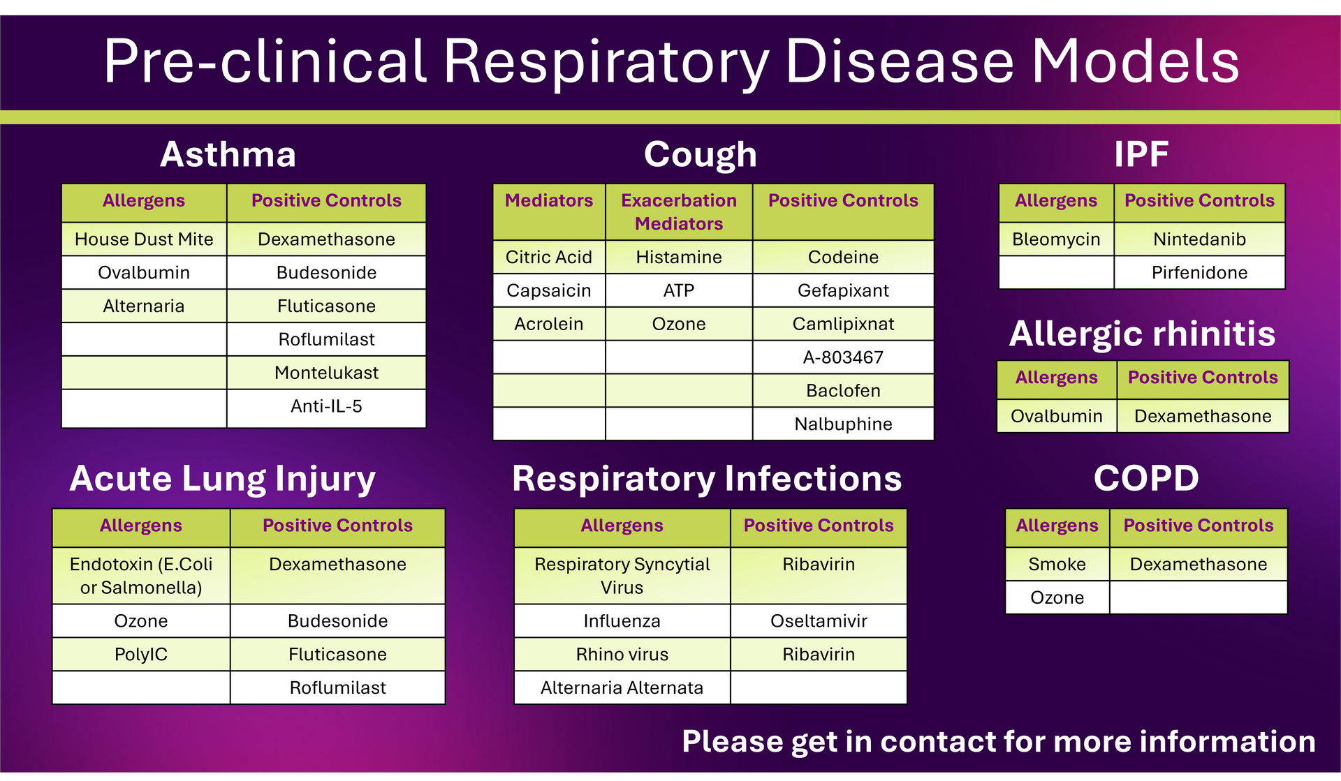 Our capabilities include validated models for asthma (acute, chronic and severe/exacerbation), cough, idiopathic pulmonary fibrosis (IPF), acute lung injury/ARDS, respiratory infections, COPD and allergic rhinitis.